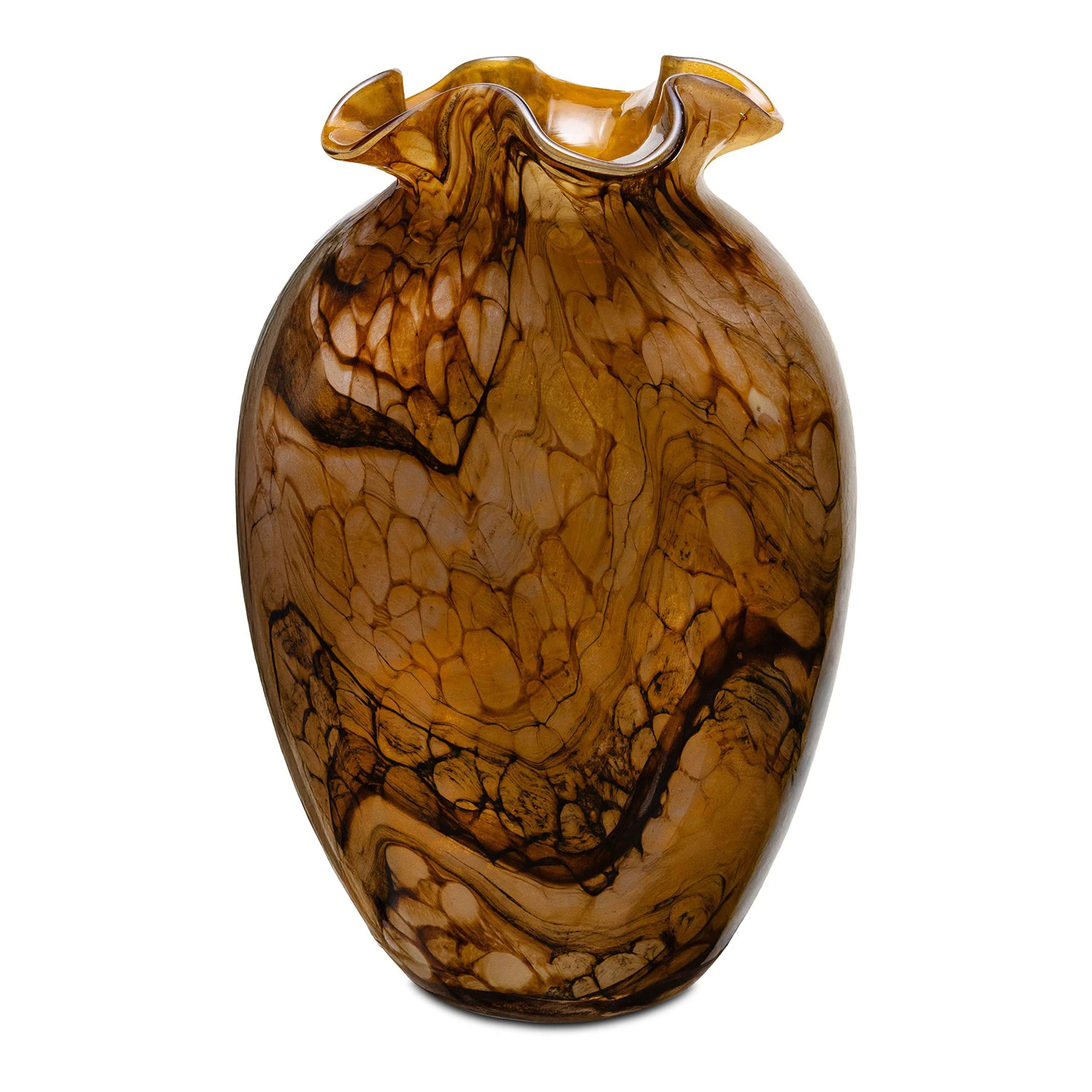 SpäťSklenená váza Amanda v jantárovej farbe s jemne zvlneným hrdlom. Elegantný doplnok s nadčasovým dizajnom, ideálny na kvety aj ako samostatný dekoračný prvok.