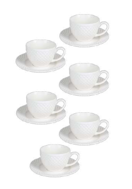 Kávový set obsahuje 6 porcelánových šálok s podšálkami, ktoré spájajú eleganciu a výrazný dizajn. Geometrická štruktúra obopína celý povrch a vytvára sofistikovaný reliéf, ktorý dodáva stolovaniu moderný, no zároveň nadčasový charakter.