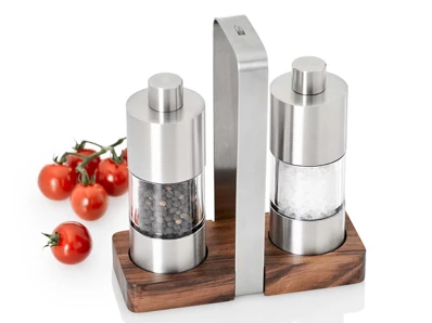 SpäťSúprava mlynčekov na soľ a korenie z nehrdzavejúcej ocele s možnosťou nastavenia hrúbky mletia prostredníctvom vrchnej skrutky. Obsahuje aj elegantný podstavec z akáciového dreva.