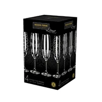 SpäťSúprava vysokokvalitných krištáľových pohárov na šumivé víno so zosilnenou stopkou a pritvrdeným horným okrajom s objemom 210 ml v klasickom nadčasovom dizajne. Obsahuje 4 rôzne vzory.