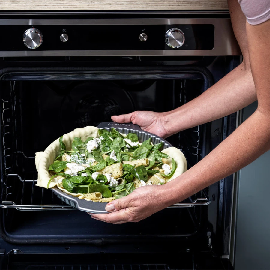 - Ergonomické rukoväte: Široké a pevné rukoväte zabezpečujú ľahkú a bezpečnú manipuláciu s pekáčom, a to aj vtedy, keď je plný a horúci. Poskytujú stabilný úchop pre jednoduché vkladanie a vyberanie z rúry.