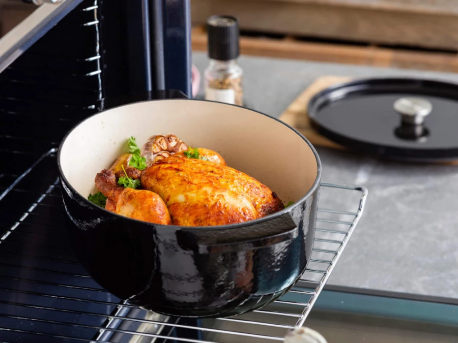 - Univerzálnosť pre každú kuchyňu: Liatinový hrniec KitchenAid je kompatibilný so všetkými typmi sporákov, vrátane indukčných varných dosiek, čo z neho robí mimoriadne prispôsobivý nástroj pre akúkoľvek domácnosť. Navyše, je bezpečný pre použitie v rúre až do teploty 260 °C, čo vám umožňuje jednoducho presunúť jedlo z platne priamo do rúry a následne na stôl.
