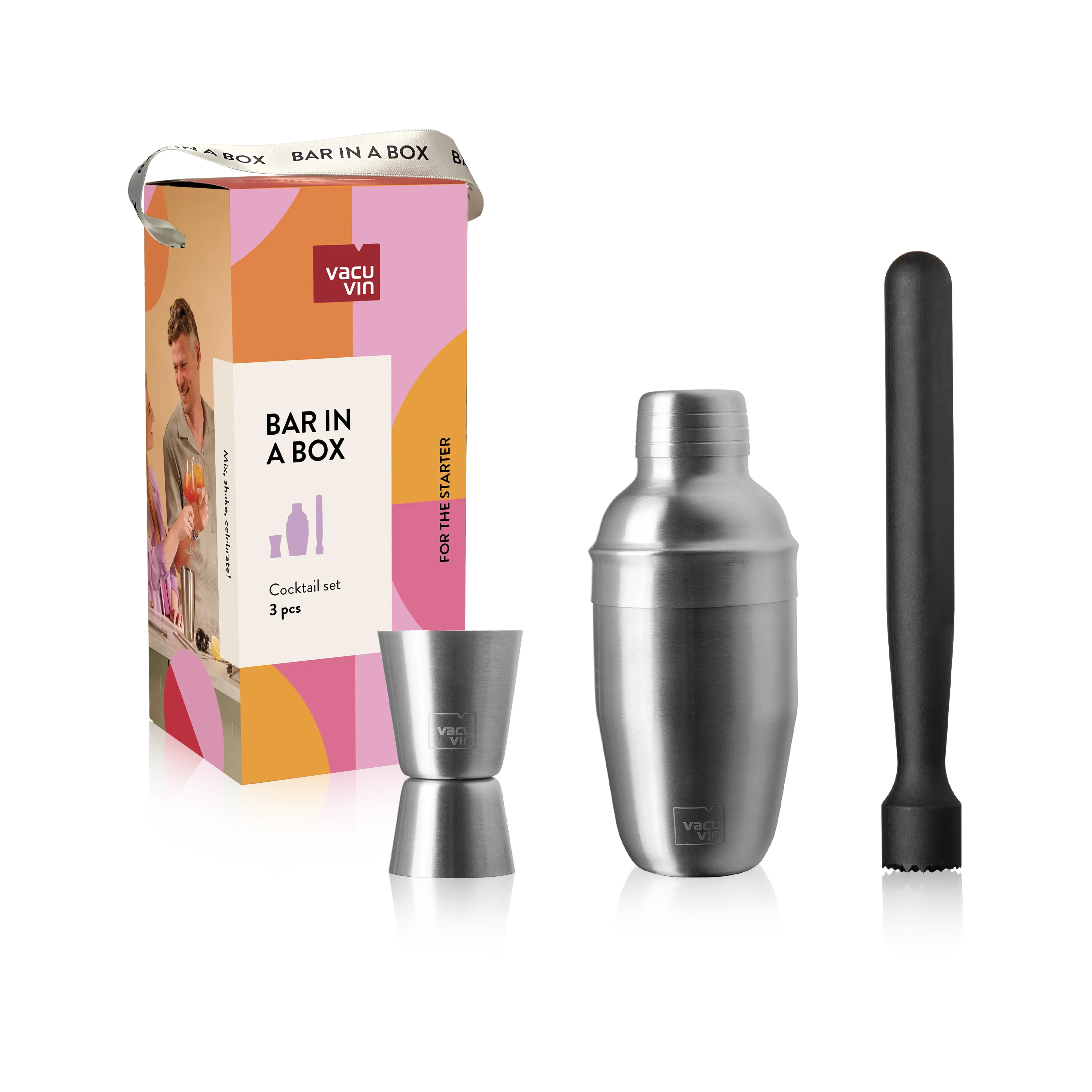 3-dielna sada Cocktail Set Bar in a Box Starter ponúka nástroje, ktoré potrebuješ na prípravu koktailov doma. Obsahuje shaker s objemom 350 ml so vstavaným sitkom, muddler na drvenie byliniek, ovocia a korenín a obojstranný jigger na presné dávkovanie.