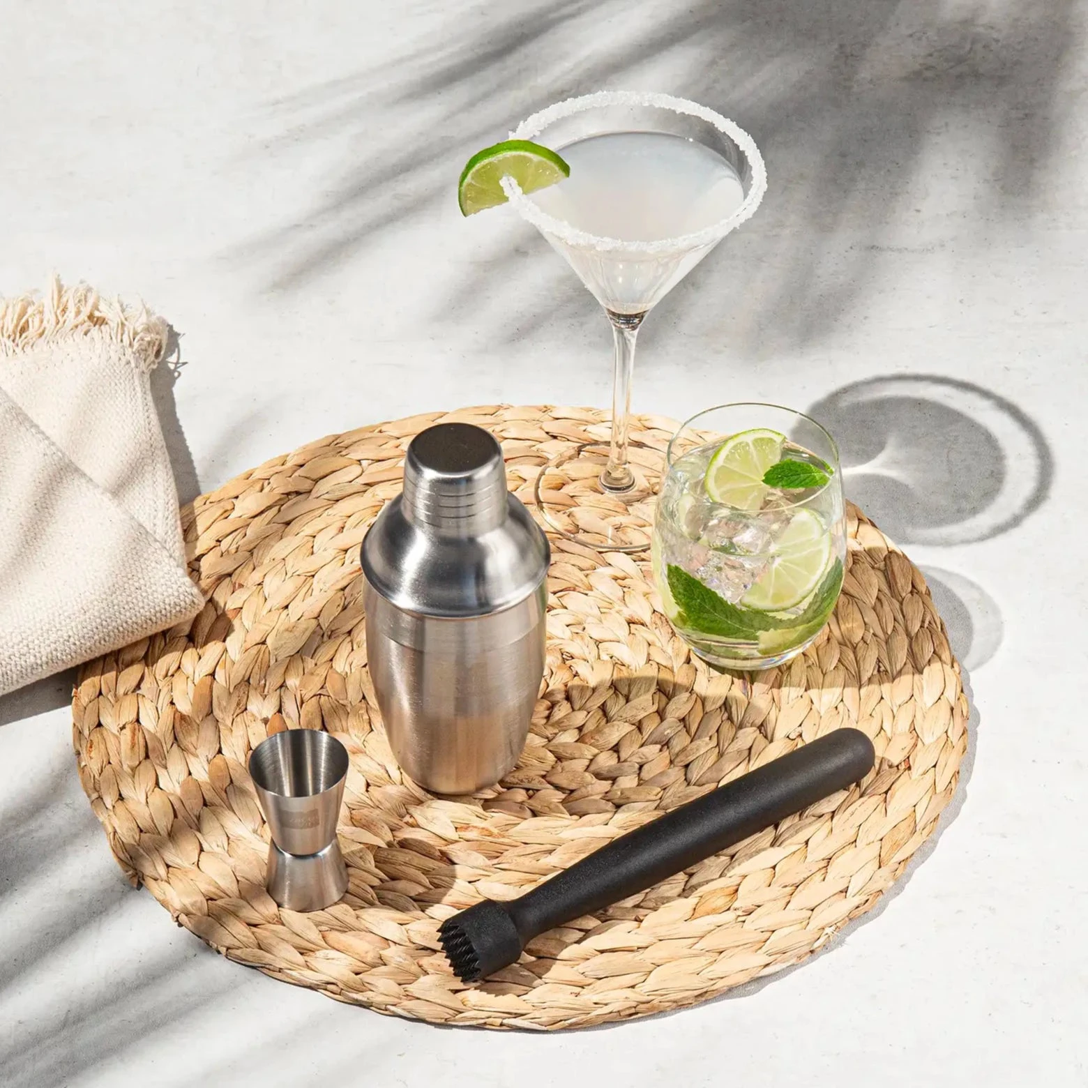 SpäťZákladná 3-dielna sada na prípravu koktailov obsahuje shaker, muddler a obojstranný jigger. Umožní ti miešať, drviť a presne odmerať ingrediencie pre tvoje obľúbené drinky doma. Praktická voľba na večierky aj bežné večery.