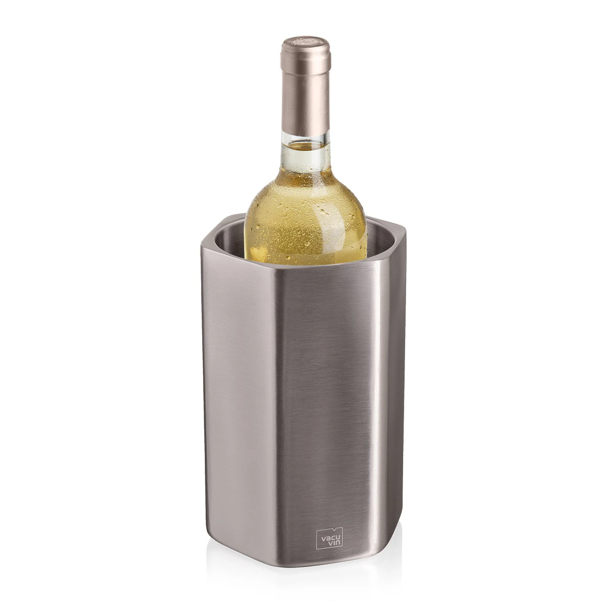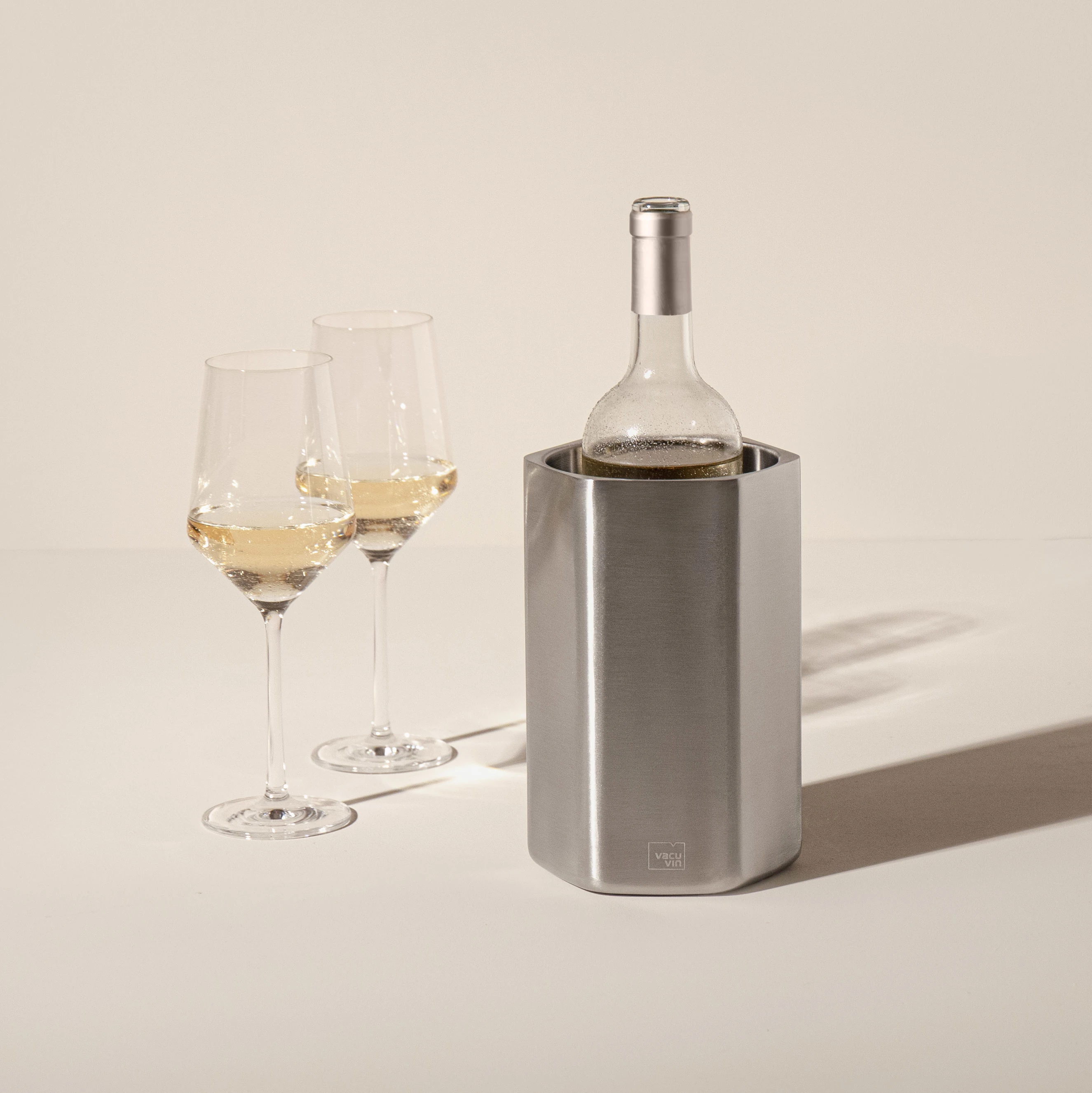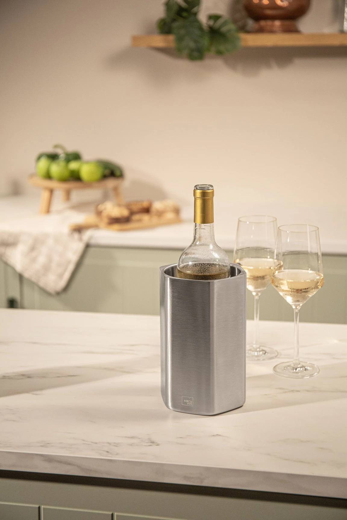 SpäťDvojstenný chladič na víno v nadčasovom dizajne, ktorého masívna konštrukcia je vyrobená z nehrdzavejúcej ocele.